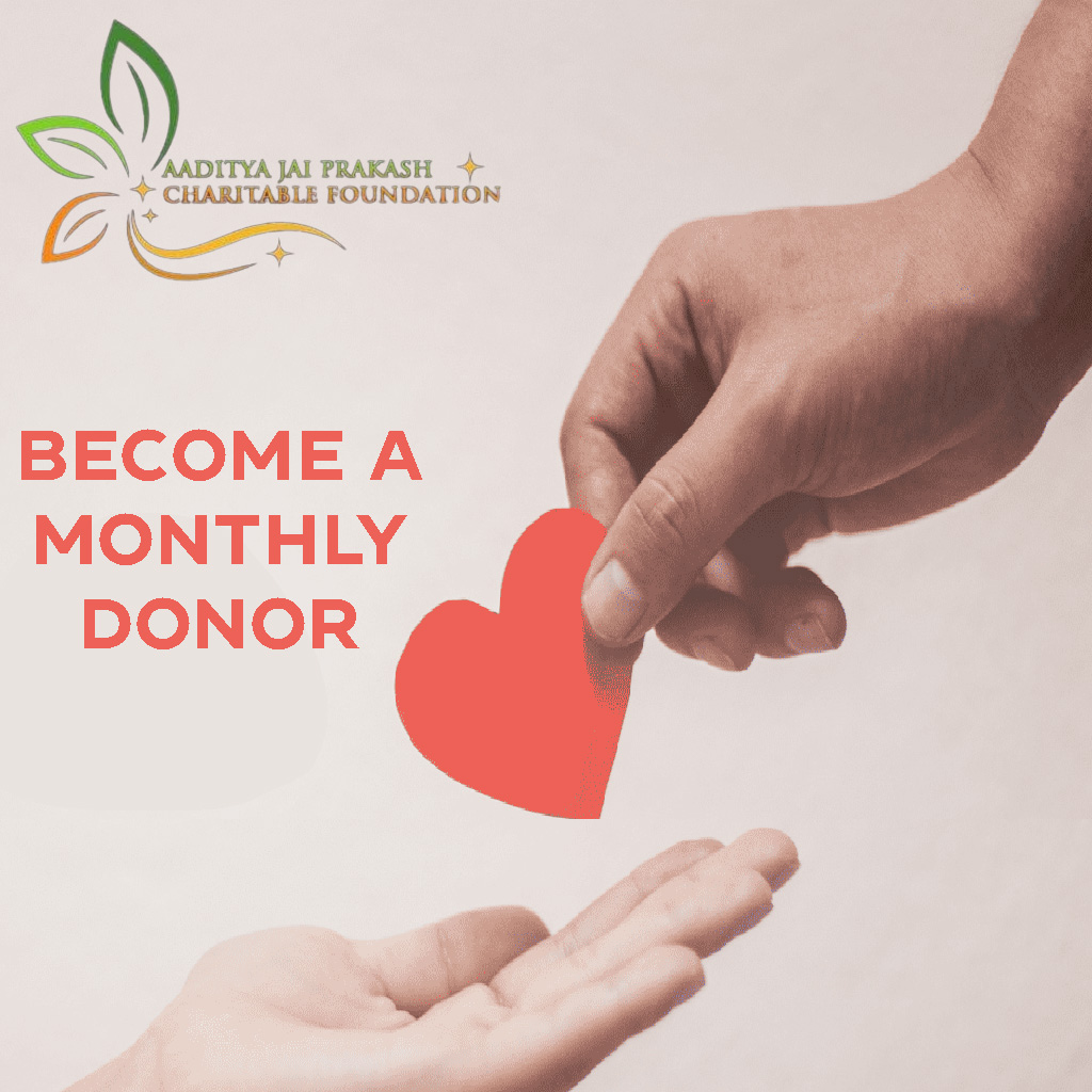 Consider donating to Aaditya Jai Prakash Charitable Foundation, regardless of the amount. Your contribution will support initiatives for child education, medical camps, and environmental conservation among other important causes. Your donation will help improve the lives of those in need. Together, we can bring about significant change and build a brighter future. Join us in making a positive impact by donating today.